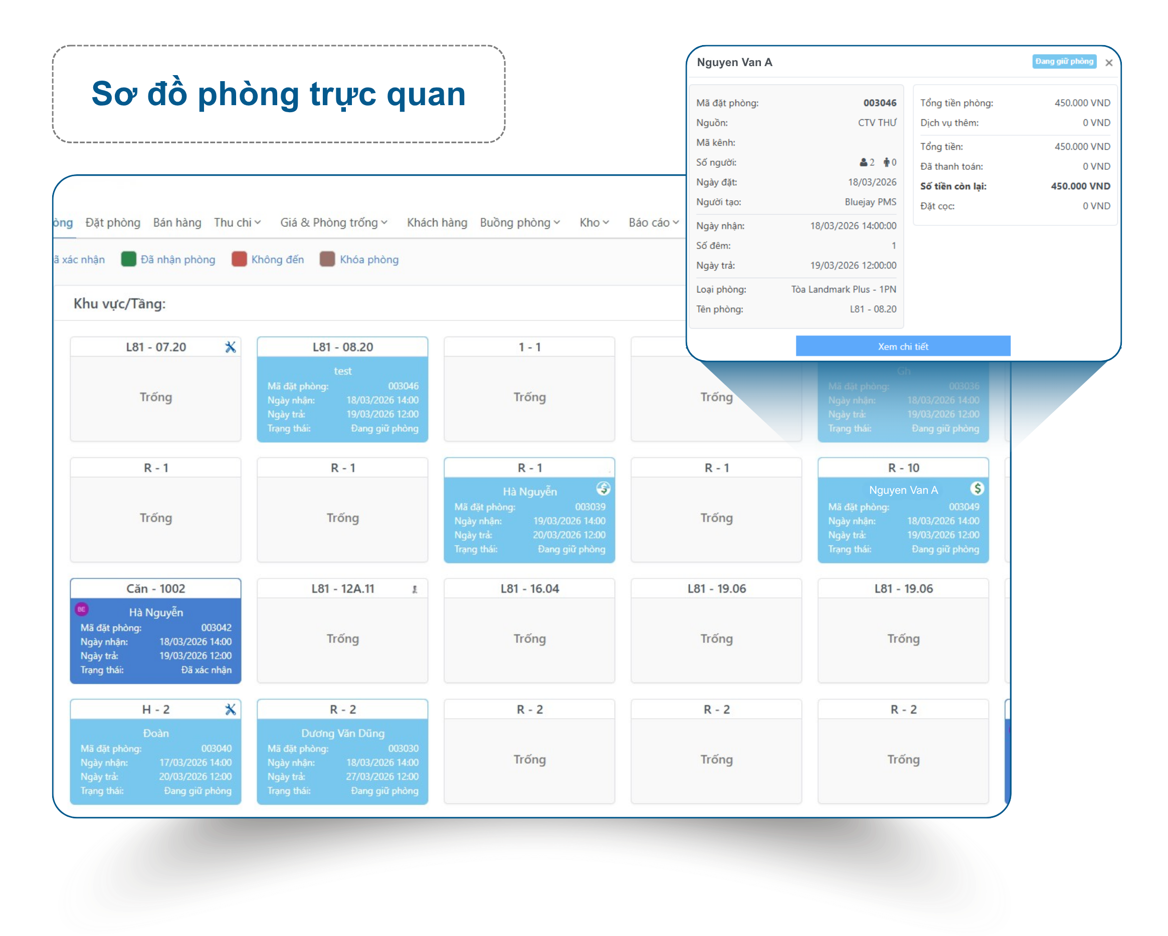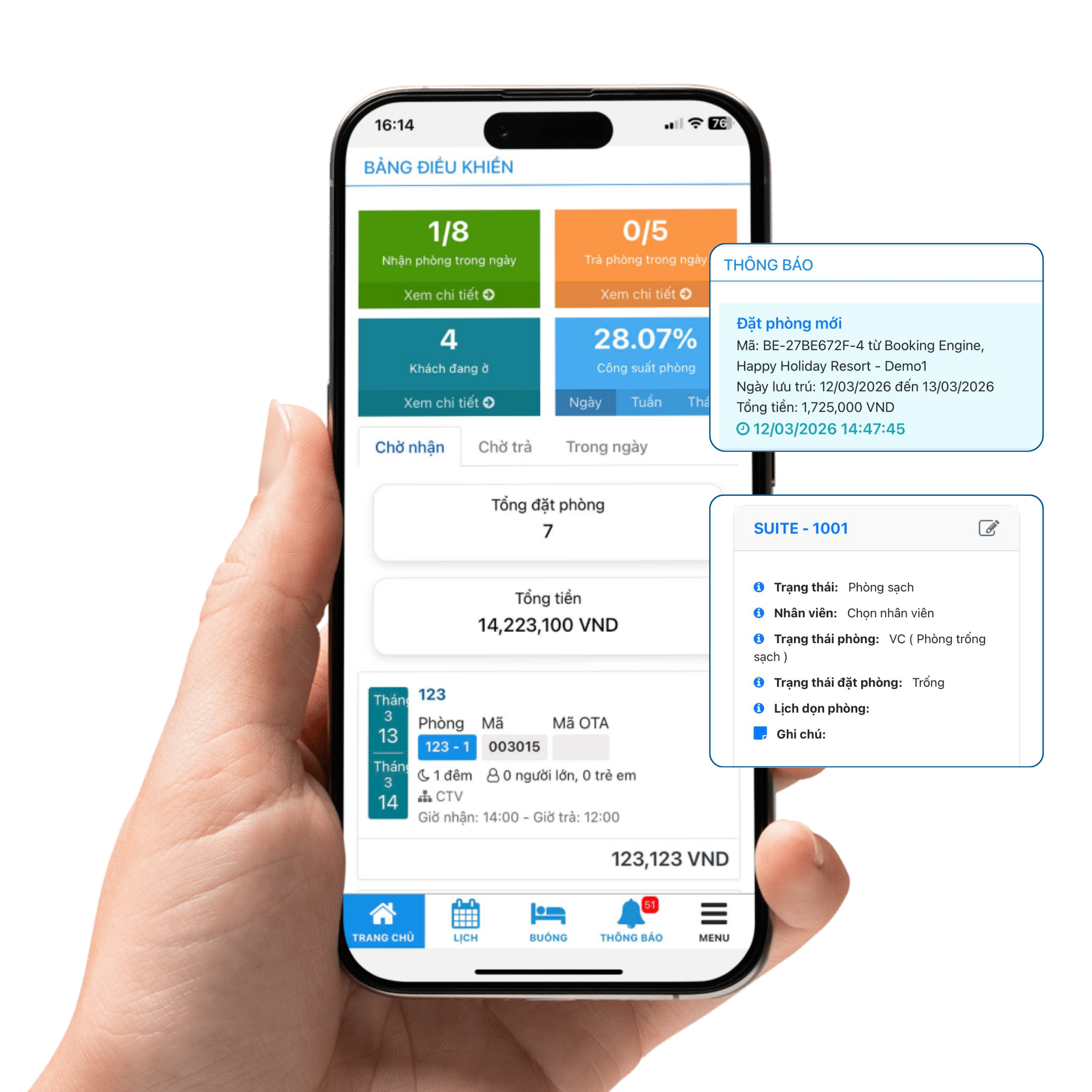 Theo dõi tình trạng phòng trống. Check-in, check-out và các dịch vụ trên một màn hình trực quan