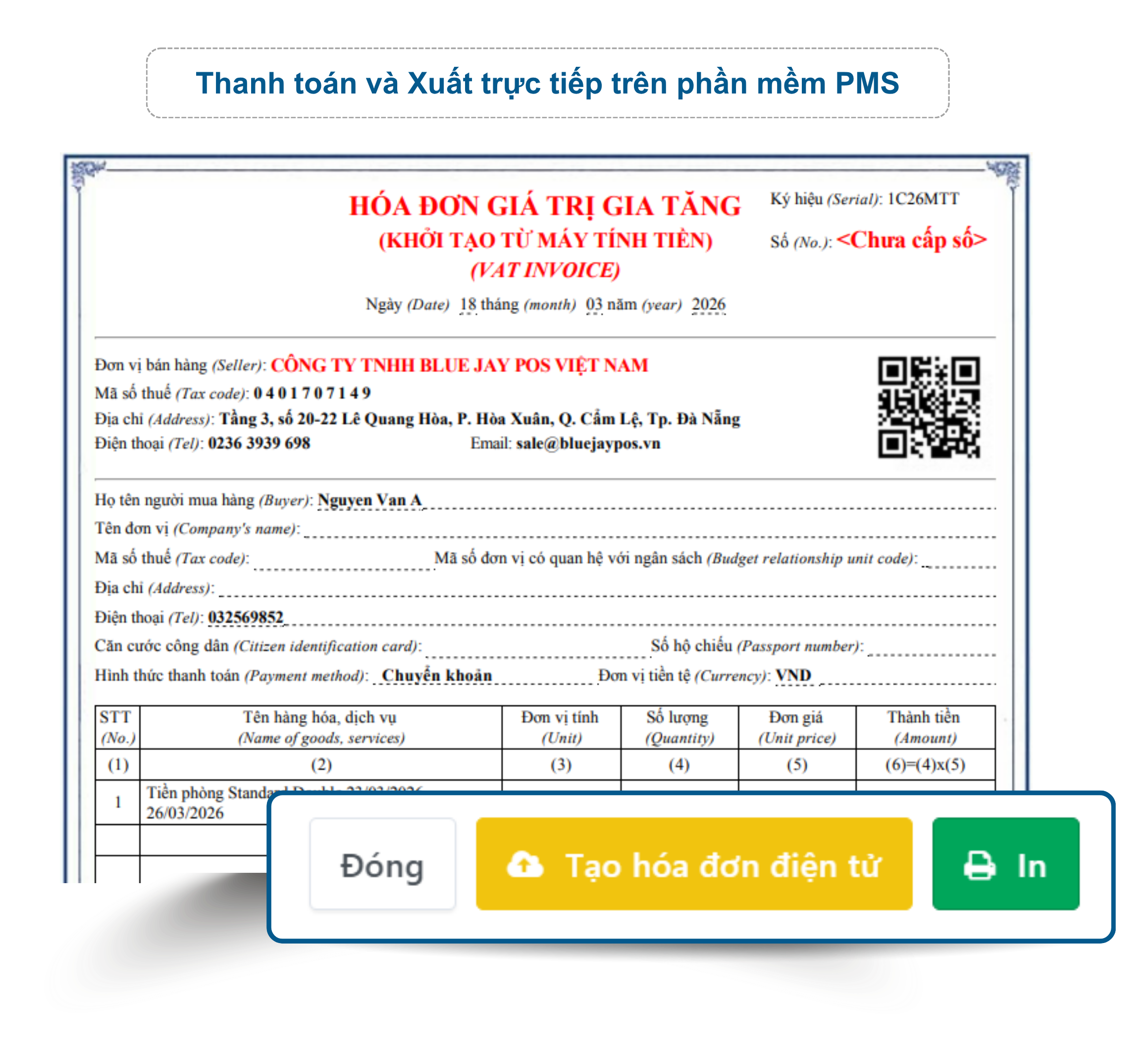 Blue Jay PMS tích hợp xuất hóa đơn điện tử ngay từ hệ thống bán phòng, giúp khách sạn nhỏ phát hành hóa đơn nhanh chóng, chính xác và đúng quy định pháp lý.
