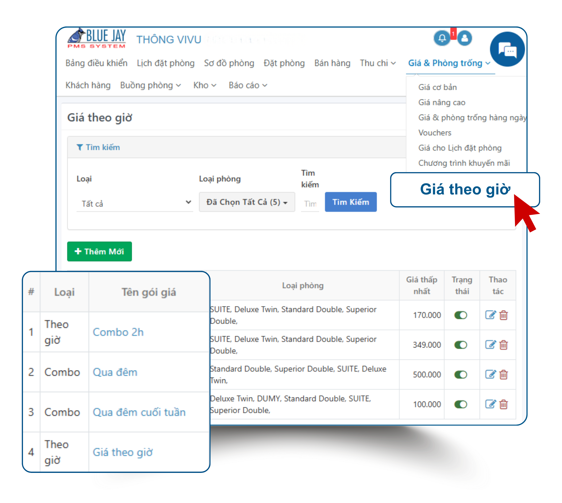 Blue Jay PMS hỗ trợ mô hình lưu trú ngắn hạn phổ biến tại các khách sạn nhỏ, giúp quản lý và tính tiền theo giờ một cách tự động và chính xác.